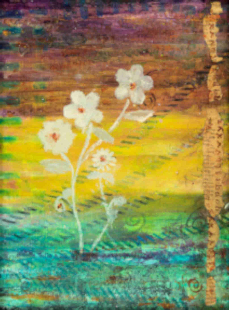 Starting her art career in watercolor with Johanna Hanks, Marie has enjoyed using other medias; charcoal, oil, acrylic and decorating gourds. Her newest art work of mixed media uses acrylics, paper and fabric creating interesting textures.